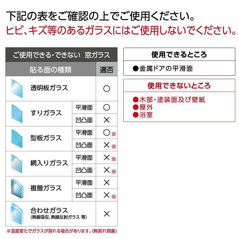 | 使用できないところ | 網入りガラス、ワイヤー入りガラス、熱線吸収ガラス、熱線反射ガラス、真空ガラス、複層ガラス、その他の特殊なガラス、ヒビやキズ等の入ったガラス ※温度差変化でガラスが割れる場合があります。(熱割れ現象) 凹凸ガラス、木部・塗装面及び壁紙、屋外・浴室 |